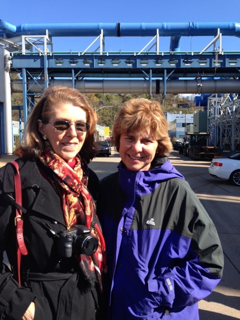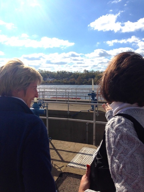 As we walked through the plant, Findley noted that ALCOSAN maintains 90 miles of pipeline along the rivers and processes up to 250 million gallons of wastewater a day. Below, Debbie Scully and Linda Ban gaze over the river where the processed wastewater spills back into the Ohio River – at that spot, approximately 120,000 gallons a minute.